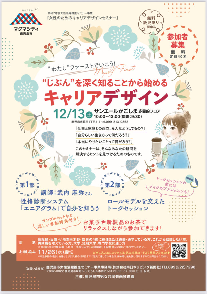 "じぶん"を深く知ることから始めるキャリアデザイン 12月13日(土)10:00〜13:00 サンエールかごしま お申し込み、お問い合わせはQRコードからお願いします。(11/26締切)
